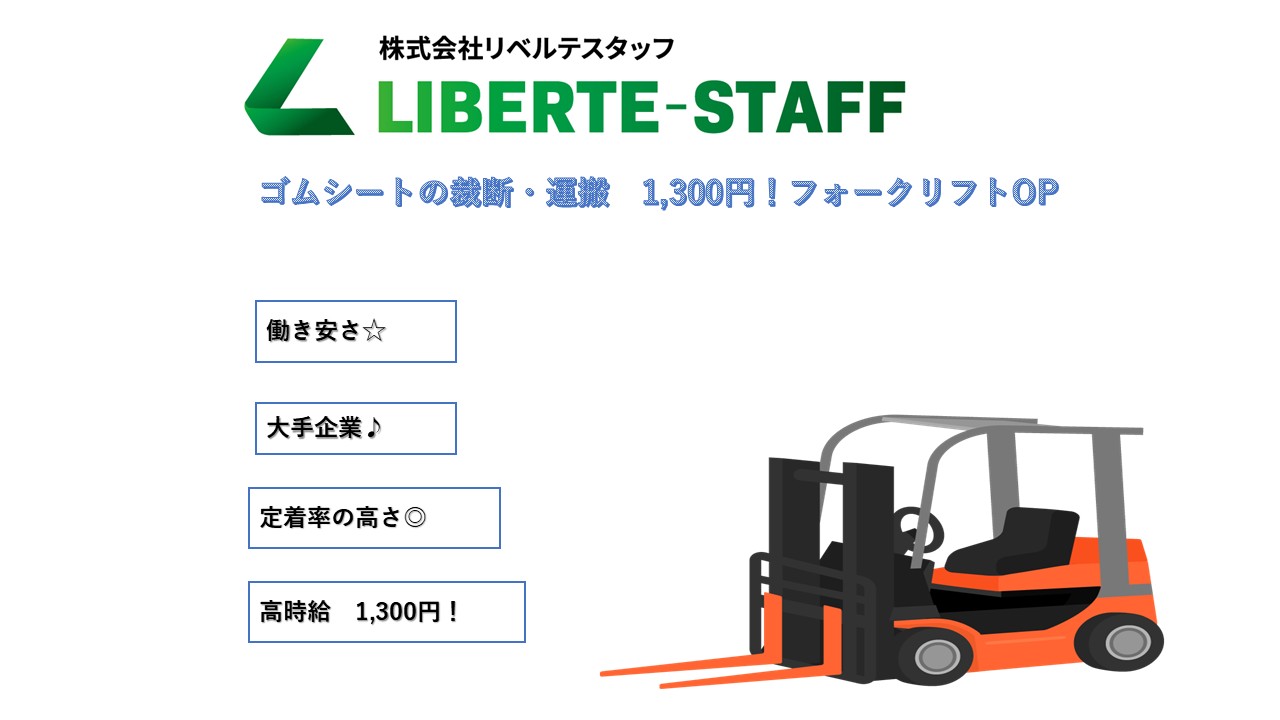 ・ゴムシートの裁断機オペレーター。厚さ1.5cm、重さ3kgにカット ・ラック台車の移動 ・フォークリフトでの積み替え ・その他付帯する業務 仕事内容 業種製造業 職種ゴム製品製造加工 勤務地 群馬県前橋市粕川町 最寄り駅 求める資格 フォークリフト技能者講習 給与 1,300円/h~1,625円 特典 16:00~00:45 勤務時間 休日 週休2日制(冬の繁忙期は1週おきに土曜休出出勤) 職場環境 雇用形態 派遣社員 待遇 社会保険完備 寮 寮なし メリット説明 ひとことPR スタッフの幸福度アップとお客様の満足度アップが使命の会社です!